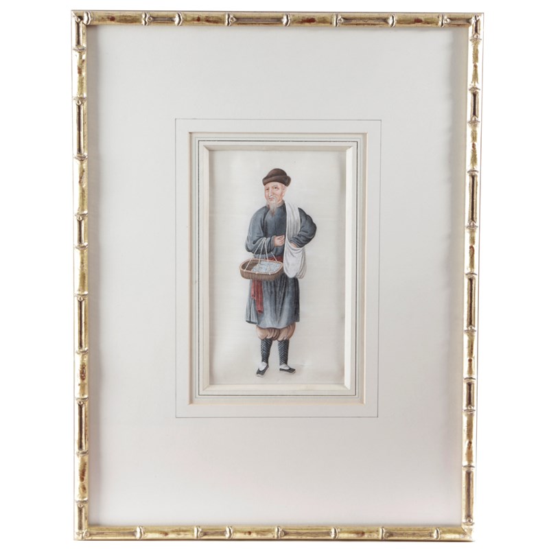depicting various courtly figures, including a man with a ruyi sceptre and a lady playing a lute, all mounted in faux bamboo gilt and glazed frames (7)