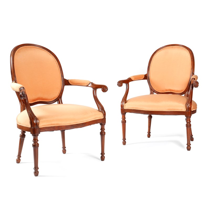 each with an oval padded back, seat and armrests, with a moulded frame and scroll arms, on turned legs (2)