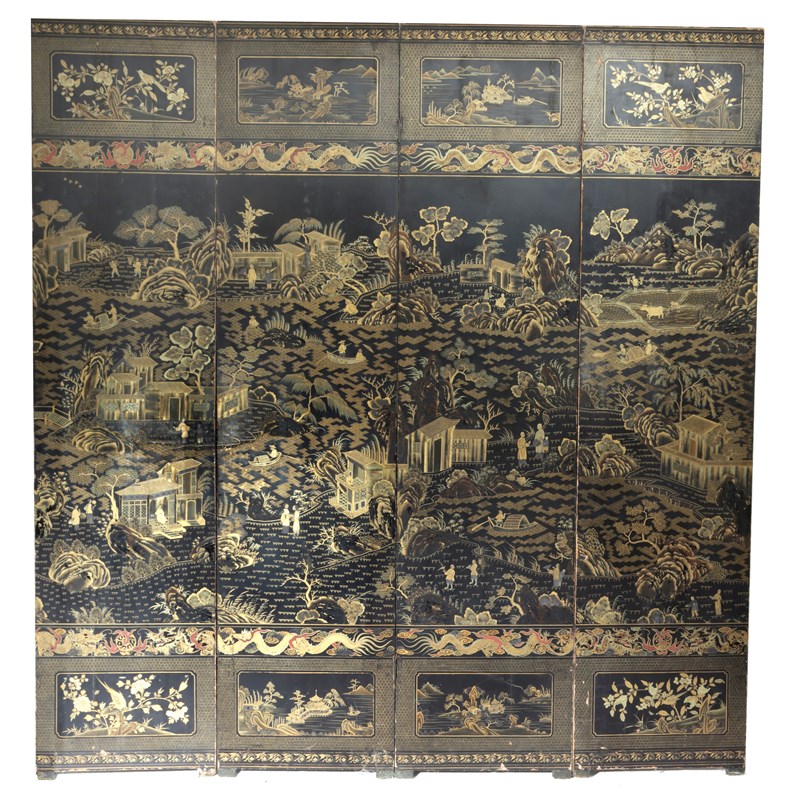 A CHINESE EXPORT BLACK LACQUER FOUR-FOLD SCREEN
