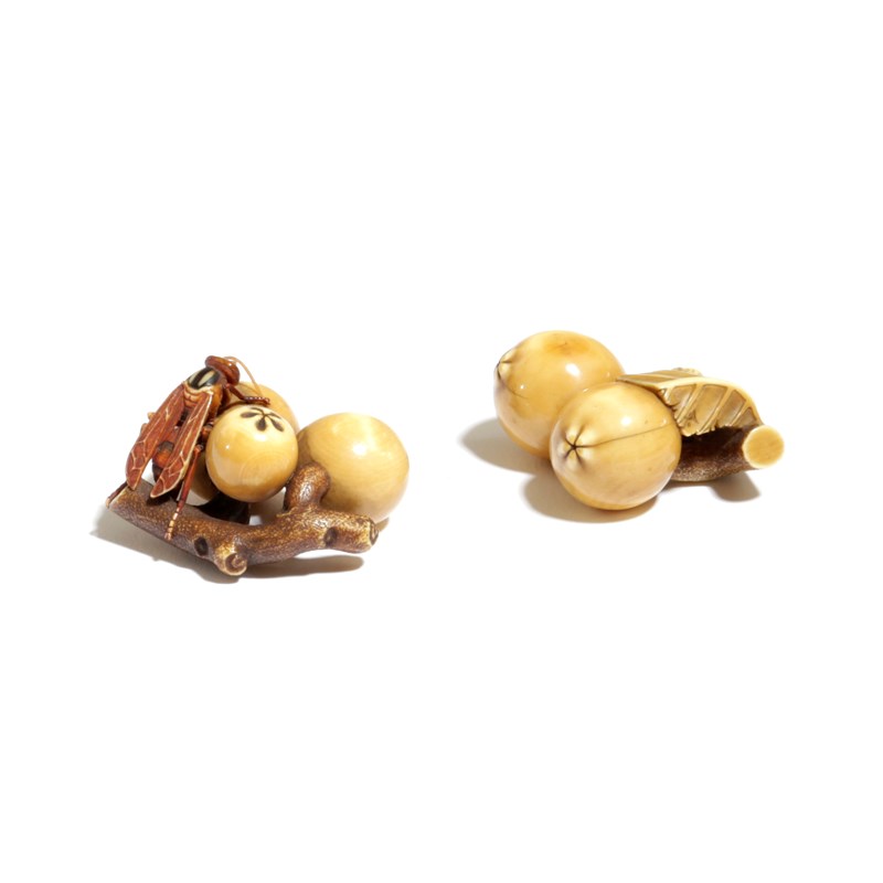 λ TWO JAPANESE IVORY NETSUKE OF FRUITING BRANCHES