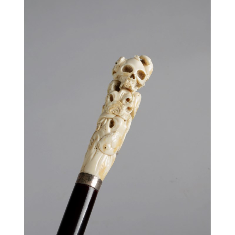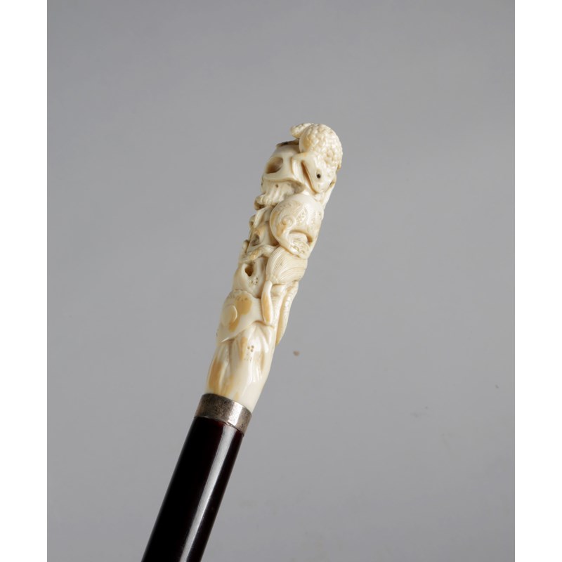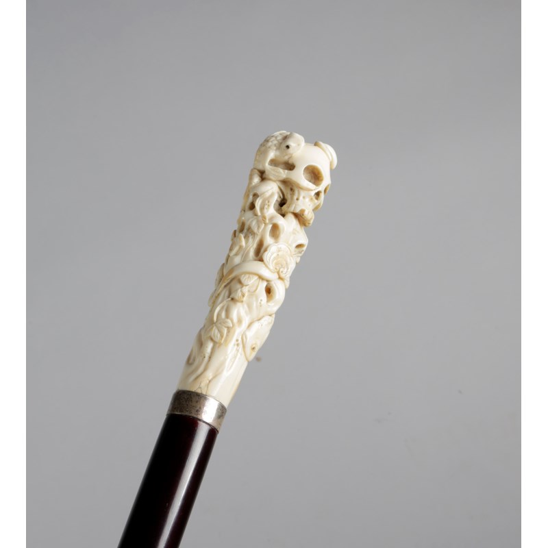 carved with two frogs, a skull, carp, a snake, a fly-whisk and leaves, above a silvered metal collar, an ebonised lacquered hardwood shaft and horn ferrule