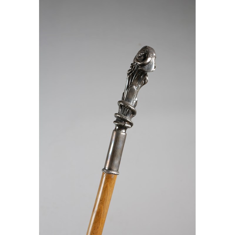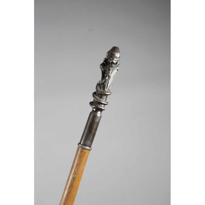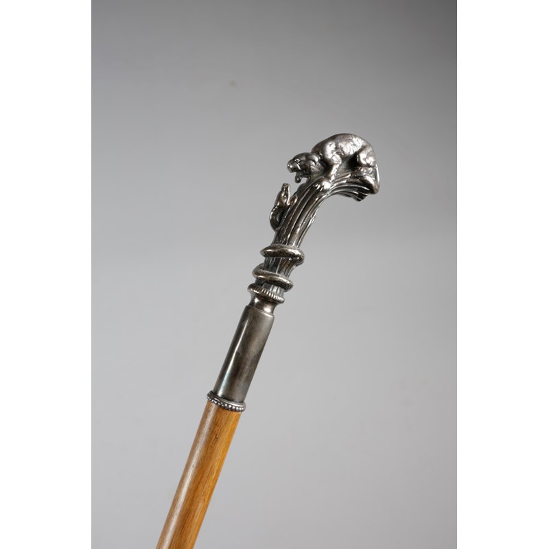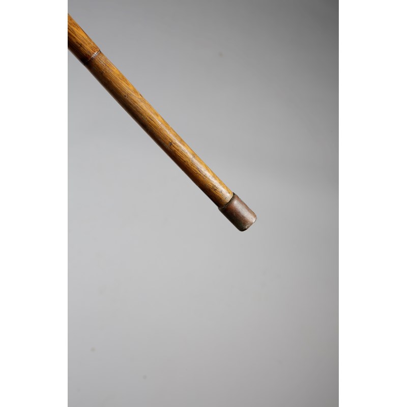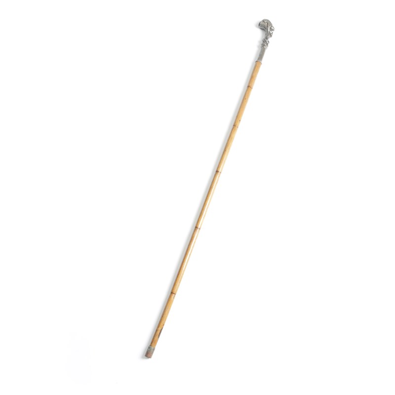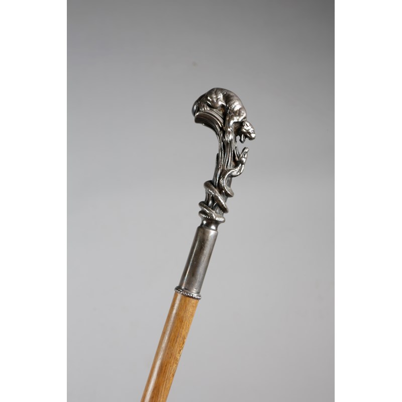 the handle decorated with a tiger and a snake, above a faux bamboo shaft and metal ferrule