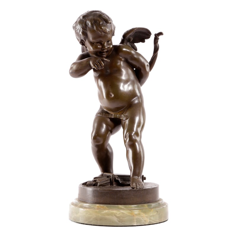 standing holding a bow in his left hand, the naturalistic base with a quiver of arrows, signed 'Rougelet', mounted on an onyx plinth