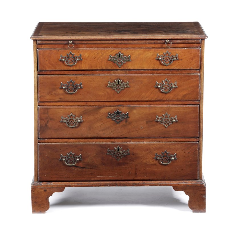 the crossbanded top with a moulded edge, above a later lined brushing slide and four long graduated drawers, on bracket feet