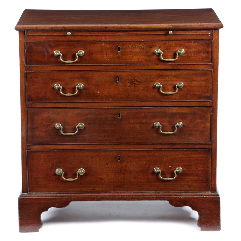 the top with a moulded edge, above a brushing slide and four long graduated drawers and bracket feet