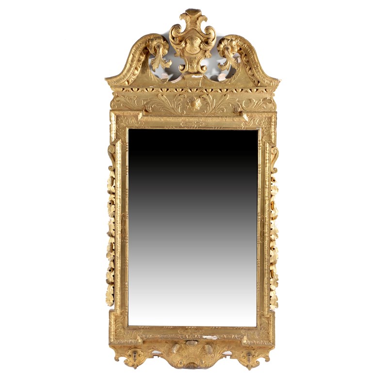the later rectangular bevelled plate within a baton and bead slip and a leaf and flowerhead carved Kentian frame, with applied scroll, oak leaf and acorn garlands, with a swan neck pediment centred with a cartouche, the base with plumes of feathers and gilt brass candle sconces
