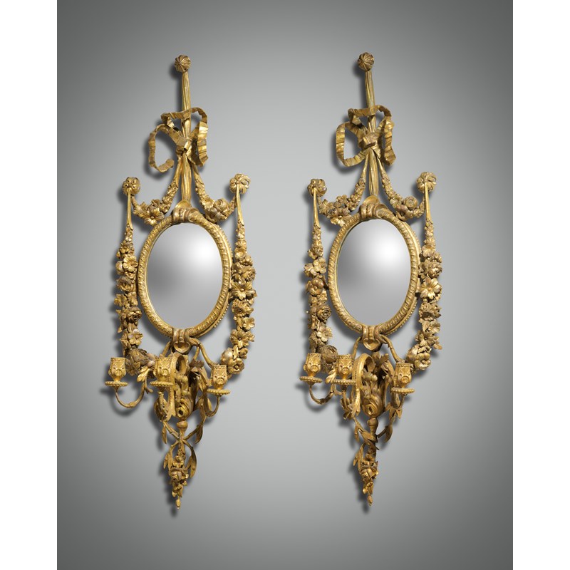 each with a later oval plate within a guilloche moulded frame, with a ribbon tied drape backplate hung with garlands of flowers, the base with three scroll candle sconces and a laurel and flower base (2)