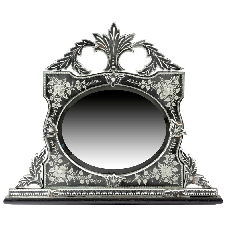 with a central oval bevelled plate, within a circular cut outer frame etched with flowers and leaves, with a scrolling leaf surmount and applied with flowerheads, the back with a later easel to use as a dressing table mirror