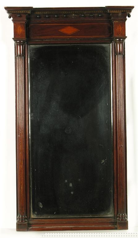 A Victorian mahogany pier mirror, the brass banded cornice above a lozenge inlaid frieze, to a bevelled plate, flanked by ribbed plasters, 36.5 x 21in (23 x 53.4cm).