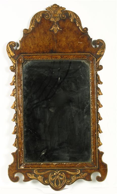 A George II style wall mirror, with simulated walnut and gilt decoration, 32.25in x 17.25in (82 x 43.8cm).