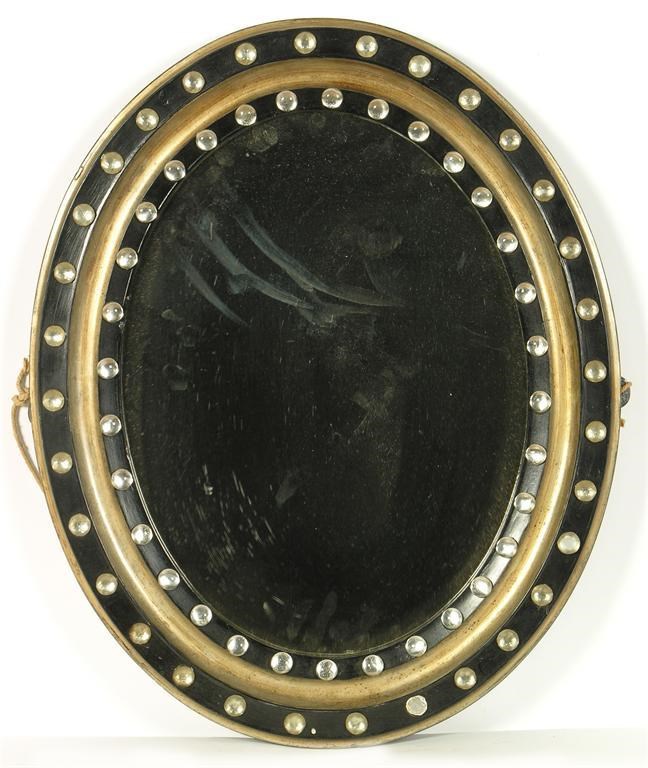 An Irish oval wall mirror, the ebonised and silvered frame applied faceted and cabochon beads, 20.25 x 16.5in (51.3 x 42cm), early 20th century.