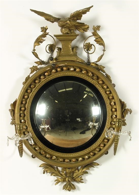 A 19th century giltwood and gesso convex mirror, with a pair of candle sconces, having cut glass drip pans, hung with lustres to brass urn shape holders, 30.5in (77.5cm) h, 20in (50.8cm), later painted.