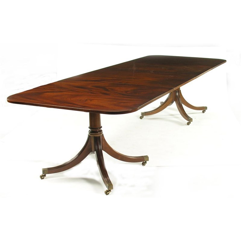 A mahogany twin pillar dining table, by Blanchards, having two extra leaves, on ring turned barrels to four reeded scroll legs with brass castors, 28.75in (73cm) h, 121cm (307.8cm) w, 45in (114.2cm) d.