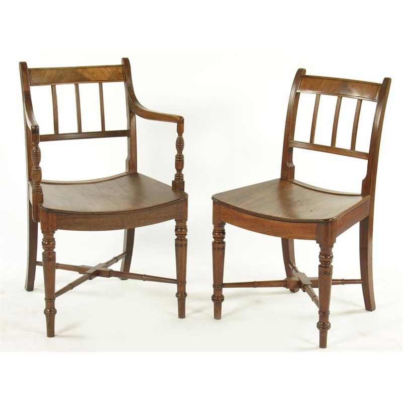 A set of eight early 19th century mahogany dining chairs, the veneered top rails to dished seats, with later squab cushions, united by ring turned and block 'X' stretchers, comprising a pair of open armchairs and six side. (8)