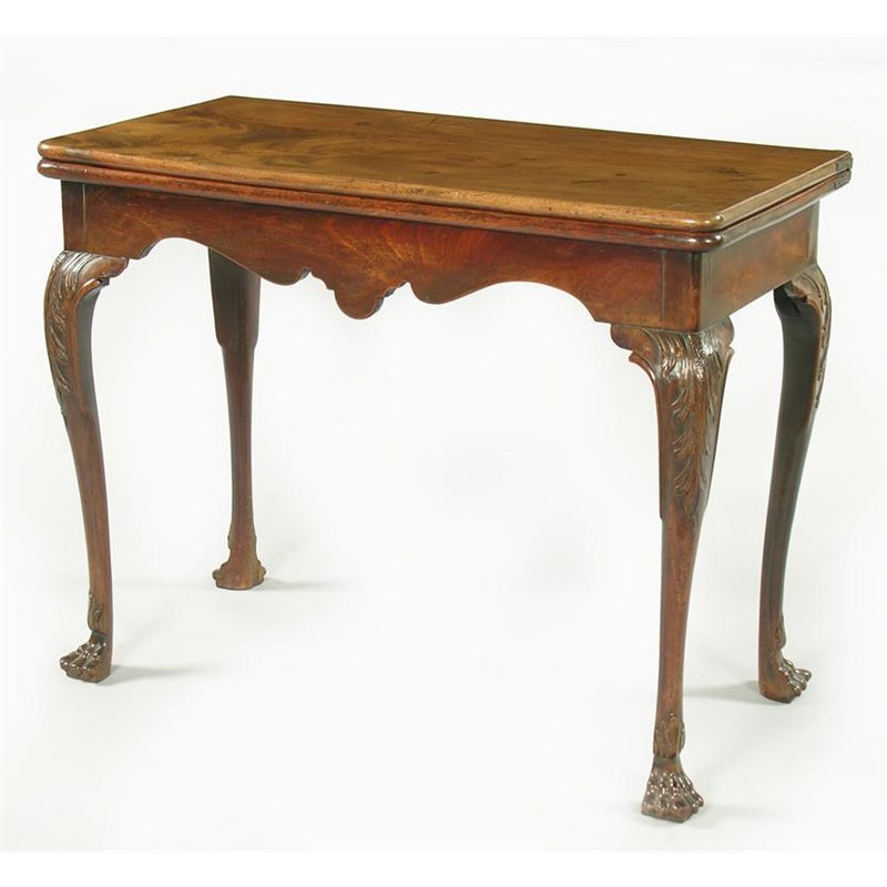 A late 18th century Irish mahogany card table, the baize lined hinged top above a shaped frieze on leaf carved cabriole legs, to conforming ankles and square paw feet, 28in (71cm) h, 35.25in (89.5cm) w, 18in (45.8cm) d.