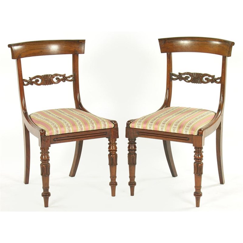 A set of five George IV rosewood side chairs, with drop in seats, old repairs. (5)