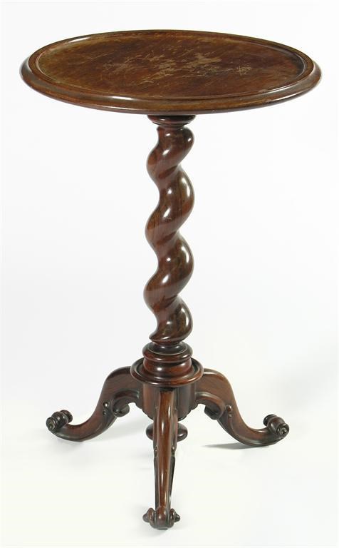 A Victorian rosewood tripod table, having a dished top, spiral twist stem, carved scroll legs with turned pendant, 29.25in (74.2cm) h, 19.75in (50cm) dia.