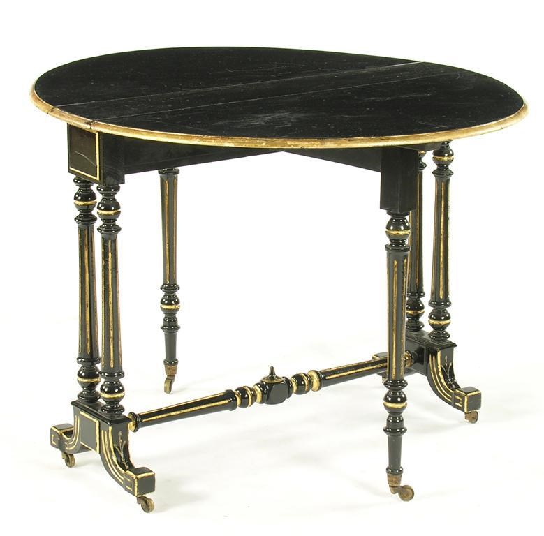 A Victorian ebonised and parcel gilt Sutherland table, with an oval top and on brass castors, 29in (73.6cm) h, 41.5in (105cm) open, 35.75in (90.7cm) d.
