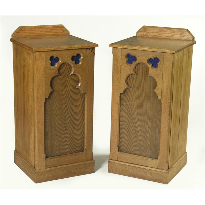 A pair of oak and ash Gothic style bedside cupboards, the shaped panel doors with inset blue glass trefoils, 35in (89cm) h, 16.25in (41cm) w, 15.5in (39.4cm) d. (2)