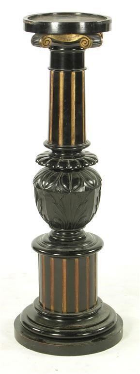 A late 19th century turned ebonised and parcel gilt torchere, 43.5in (110.4cm) h.