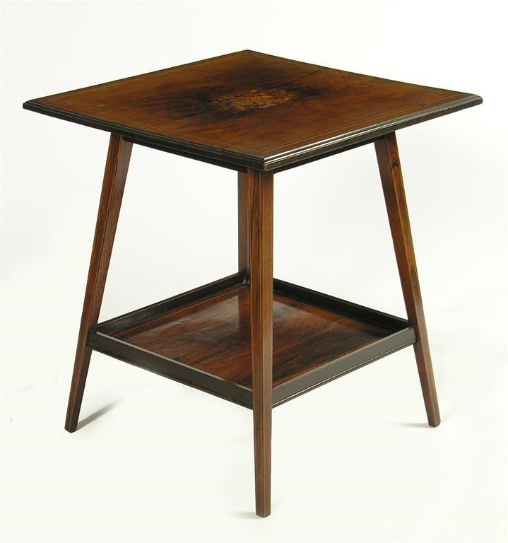 A late Victorian rosewood two tier table, the top centred a floral marquetry spray, 25.25in (64cm) h, 23in (58.4cm) w.