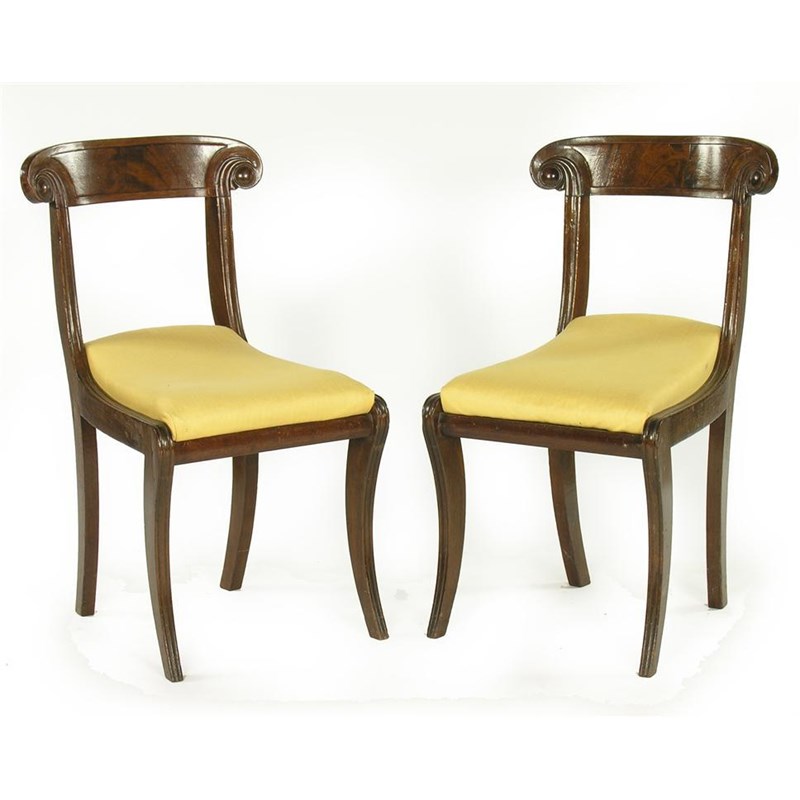 A set of six mahogany 19th century side chairs, with raised drop in seats, old restoration. (6)
