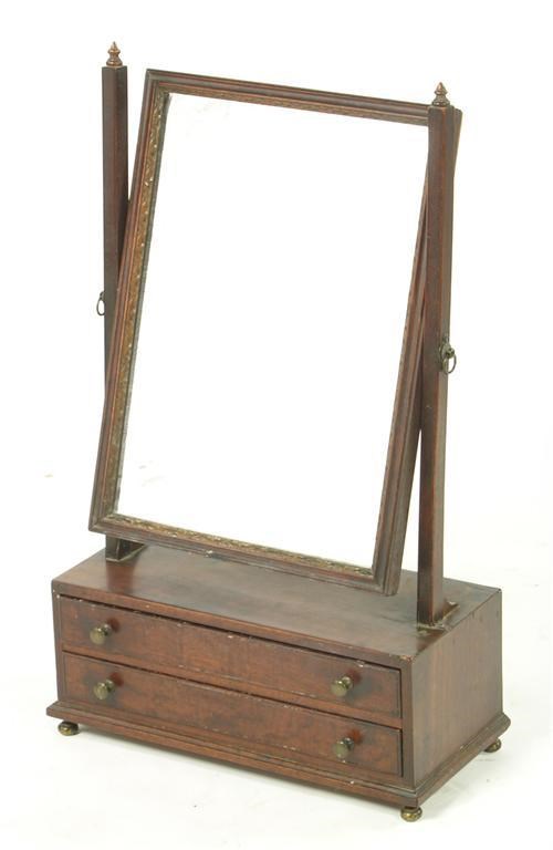 A mid 18th century mahogany dressing table mirror, with a carved giltwood inner frame, the box base with two long drawers, 24.5in (62.2cm) h, 15in (38cm) w, 7in (17.8cm) d.