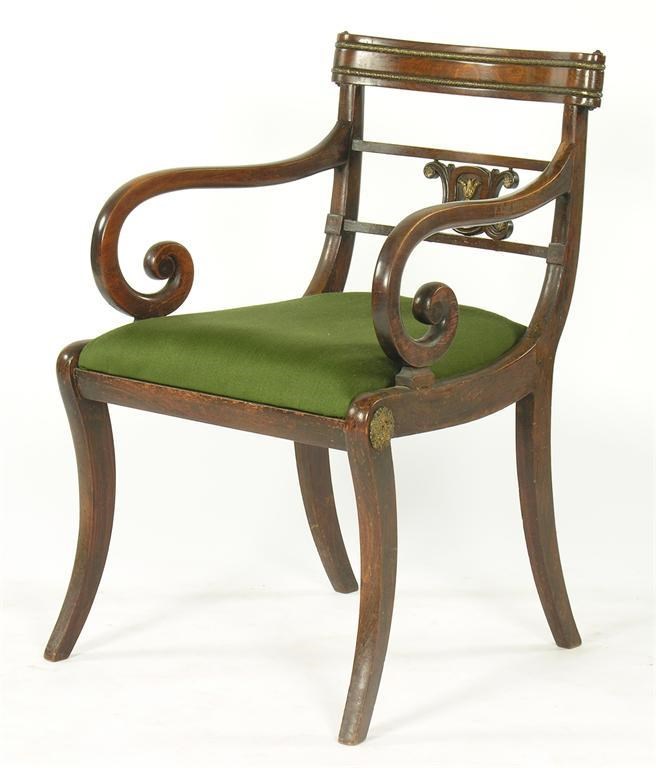 A Regency simulated rosewood and gilt brass mounted open armchair, with a curved and scroll terminal top rail.