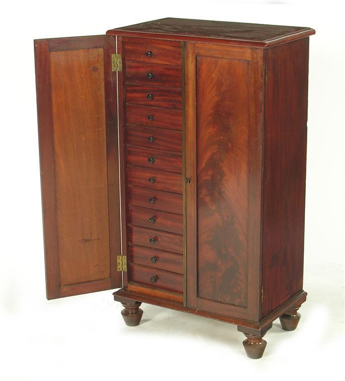 An early Victorian mahogany collector's cabinet, the pair of panel doors enclosing twelve drawers with glass tops, six missing, 41in (104cm) h, 23in (58.4cm) w, 13.75in (35cm) d.