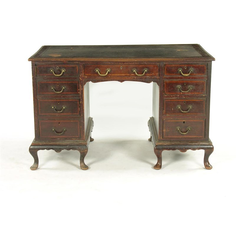 A mahogany twin pedestal desk, inlaid chevron banding, the leather inset top above a frieze drawer, a cupboard door, a fitted deep drawer and two short drawers, the brass locks stamped 'HOBBS & CO', on cabriole legs, 30.5in (77.5cm) h, 48in (122cm) d, 27in (68.5cm) d.