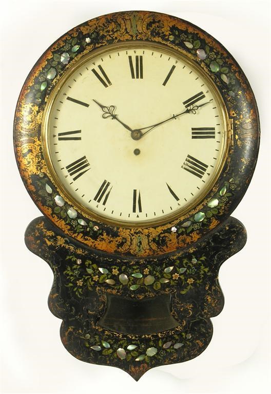 A Victorian Pontypool tin drop dial wall clock, the single fusee movement to a painted dial and brass bezel, the case inlaid mother of pearl with gilt highlights, 25in (63.5cm) h, 16.75in (42.5cm) w.