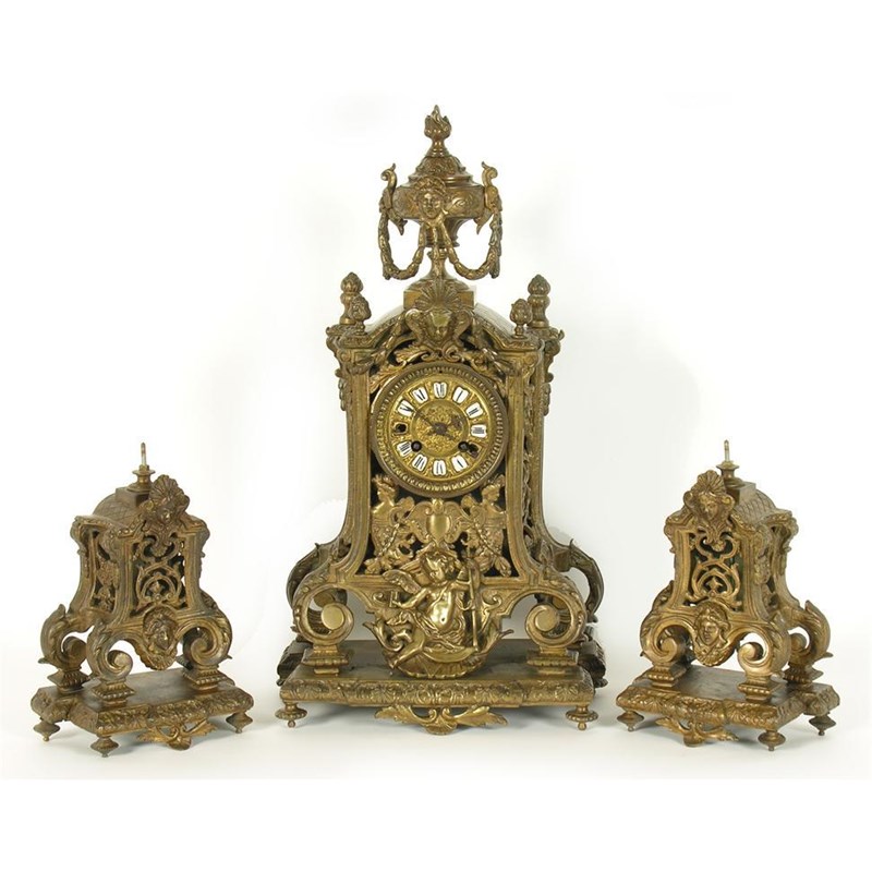 A 19th century gilt brass clock garniture, the 8 day movement stamped 'H & F PARIS,' with a outside countwheel and striking a bell to a circular dial with inset enamel numerals (two missing), 19in (48.2cm) h, the pair of flanking stands, missing their tops. (3)