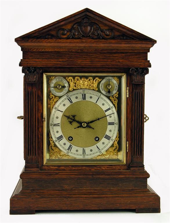 An oak cased mantel clock, the 8 day movement striking on two gongs to a silvered chapter ring, inscribed 'Manoah Rhodes & Sons Ltd Bradford', with subsidiary regulator and Chime/Silent dials, the sides with hinged doors, 16.5in (42cm) h.