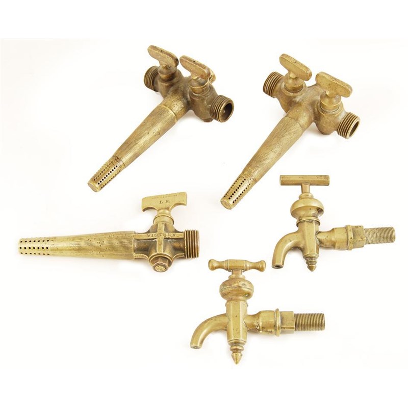 Five brass spigots, including two with twin taps, another stamped 'Gaskell & Chambers', and 'Victory'. (5)