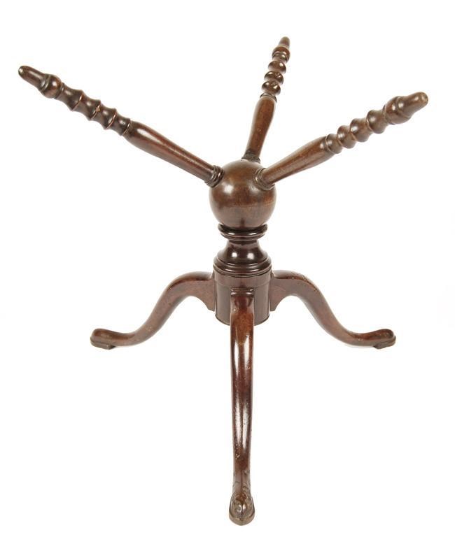 A George III turned mahogany cat, raised on three scroll legs with a revolving ball issuing three supports, 13in (33cm) h, 13.75in (35cm) w. Two legs repaired, one support cracked, another burnt.