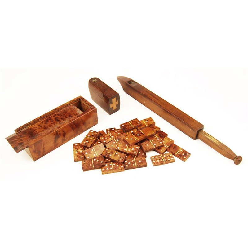 A mahogany slide whistle, the slide with hand written notes, 13.25in (33.5cm) l, a mahogany snuff box with two hinged covers the front inlaid a satinwood cross and a box set of burr yew wood dominoes inlaid mother of pearl. (3)