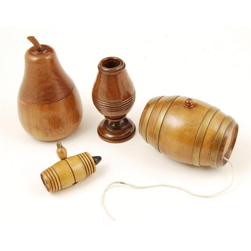 A turned walnut and parcel gilt string barrel, inscribed 'Castellane' with screw off cover, base missing, 5in (12.5cm) l, another smaller barrel, a turned treen pear shape box and cover, and a turned spill vase. (4)