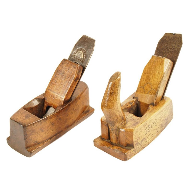 A treen moulding plane, with punched decoration and date '1808', with a steel blade, 4.75in (12cm) h, and another stamped 'G.H.SMITH', the cast steel blade stamped 'W.OUTRAM & SON, SHEFFIELD.' (2)
