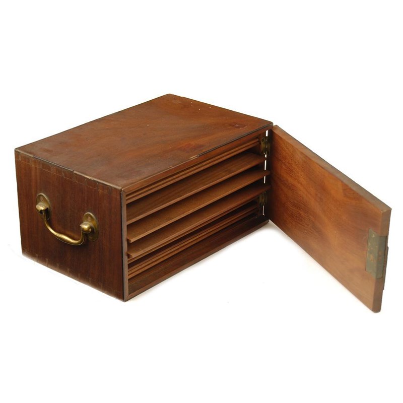 A late George III mahogany botanist's specimen chest, with ebony edging and gilt brass side handles, having a hinged door revealing six slides and six smaller press slides, 5.75in(14.5cm) h, 11in (28cm) w, 7in (18cm) d.