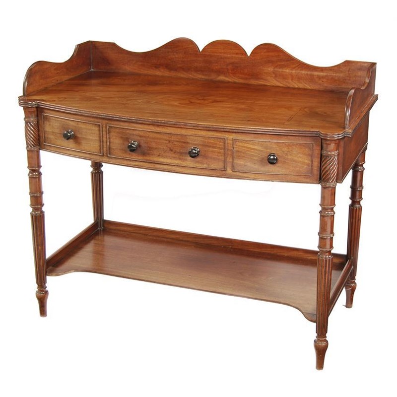A Regency mahogany bowfront washstand in the manner of Gillows, the wavy edge three quarter gallery above a reeded edge top and three false frieze drawers, fitted turned ebony handles, on spiral reeded and turned ribbed tapering legs united by a galleried undertier, 36.75in (93.4cm) h, 43in (109.2cm) w, 24in (61cm) d. Old damages, replacements and restoration.