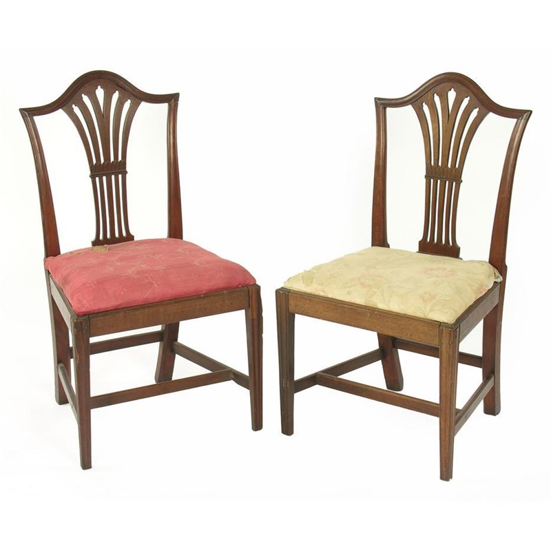 A set of four George III mahogany side chairs, the arched backs with pierced vase shape splats, having differing covered drop-in seats. (4)