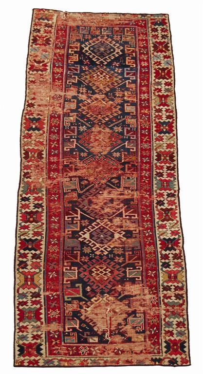 A Karabakh runner, South West Caucasus, 2nd half 19th century, 106.5 x 43in (270.5 x 109cm). Very worn with holes.