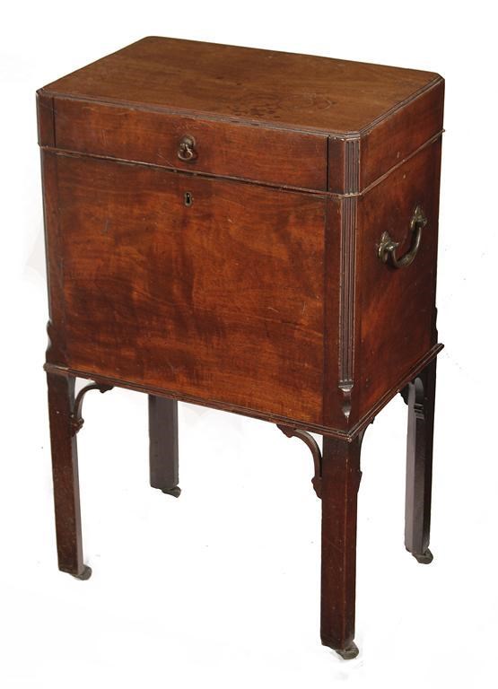 A late George III mahogany cellaret, with fluted angles, the hinged top with a later pierced divider (previously divided for six bottles), brass side carrying handles on square chamfered legs with open scroll brackets, on leather roller castors, 26.5in (67.5cm) h, 16.5in (42cm) w, 11.25in (28.5cm) d.
