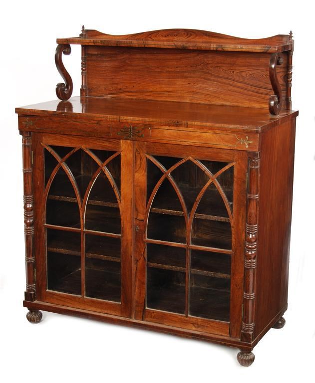 A William IV rosewood, simulated rosewood and brass inlaid chiffonier, with a pair of lancet arch glazed doors enclosing fixed shelves, on lobed front supports, 46.25in (117.6cm) h, 38.75in (98.4cm) w, 18.25in (46.6cm) d.