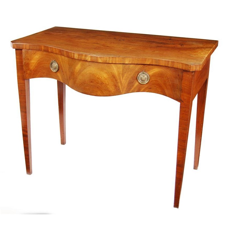 A late George III mahogany serpentine front side table, with a frieze drawer fitted replaced brass handles, on square tapering legs, 33in (84cm) h, 42.25in (107.2cm) w, 24.25in (61.6cm) d.