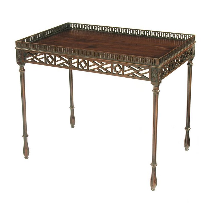 A George III mahogany silver table, the pierced and inlaid gallery above a fret work frieze on fluted supports headed by carved floral paterae on a matted ground, the base with an old label with inscription 'This table belongs to Kathy Foyle?', 28.5in (72.3cm) h, 33.25in (84.5cm) w, 22in (55.8cm) d. Old damages and restorations.