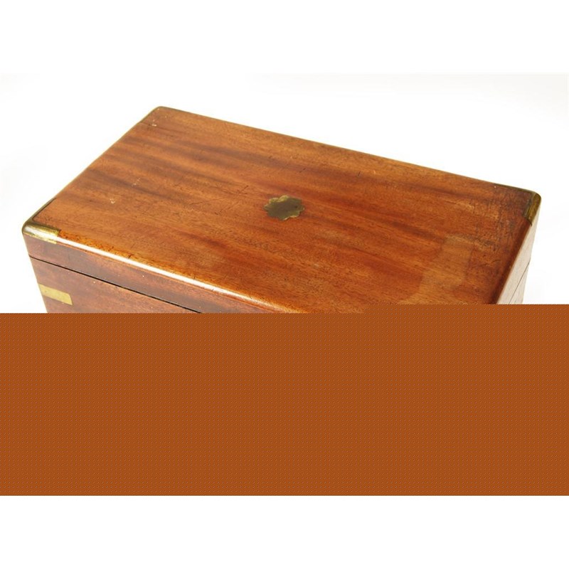 A Victorian mahogany and brass bound writing slope, with a gilt tooled leather lined interior, secret drawers, cover missing, and a side drawer, 6.75in (17cm) h, 17.75in (45cm) w. 4.5in. Crack to the top, lock missing.