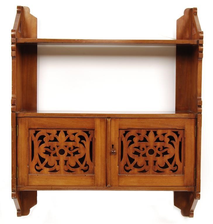 A Victorian mahogany hanging shelf, with a pair of pierced rectangular panel doors, 31.25in (79cm) h, 26.25in (66.5cm) w, 7.5in (19cm) d.