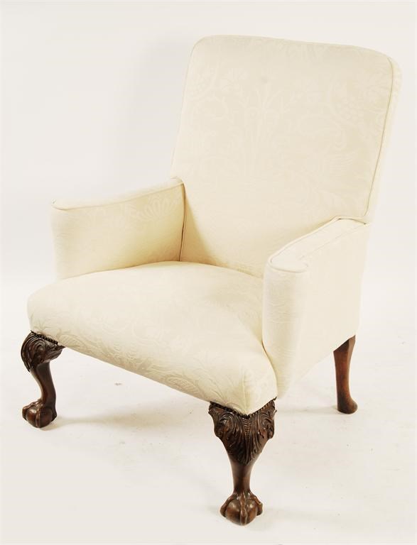 A late 19th century upholstered easy armchair, with scroll arms on walnut foliage carved cabriole legs to claw and ball feet.