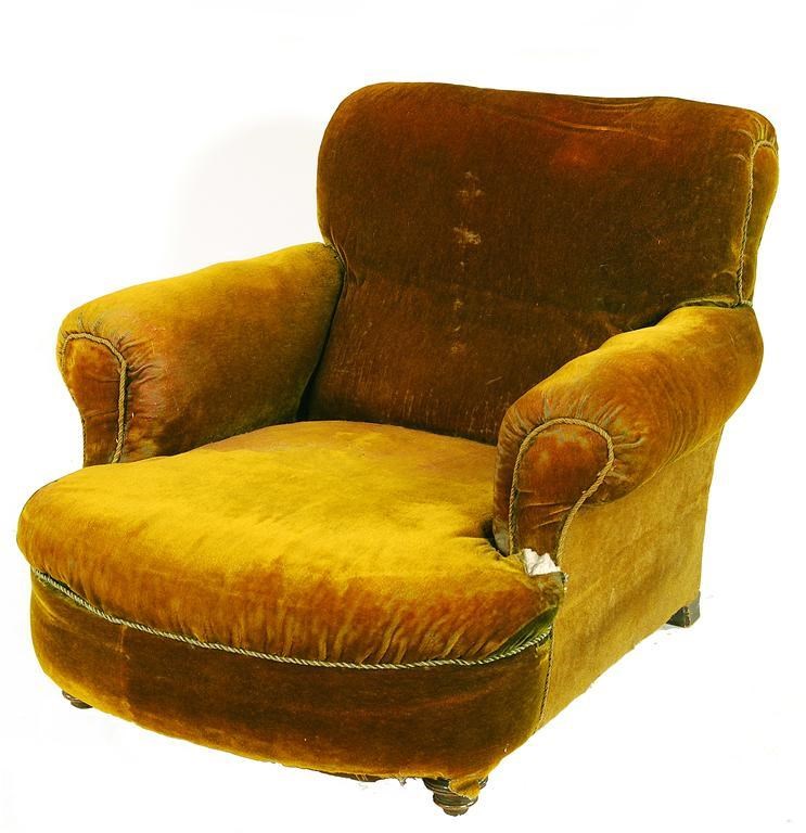 A late Victorian club easy armchair, in the manner of Howard & Sons, on turned walnut legs castors missing.